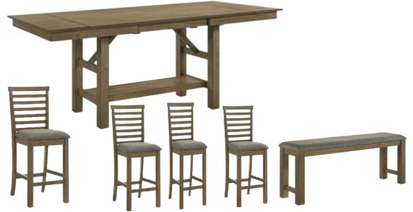 Set includes gathering table, 1 upholstered counter bench and 4 slat back upholstered counter chairs